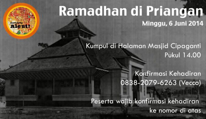 Sampurasun, Aleutian! Minggu (6 Juli 2014), tema kali ini adalah Ramadhan di Priangan. Penasaran ngabuburit ala Komunitas Aleut? Atau penasaran ngabuburit tempo dulu di Bandung seperti apa? Ayo, kita ngaleut di Komunitas Aleut! Kumpul di Mesjid Cipaganti pukul 14:00. Konfirmasi ke 082-315-010-836. Ayo kita ngaleut Ramadhan di Priangan.