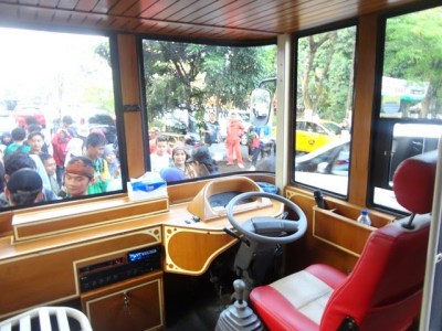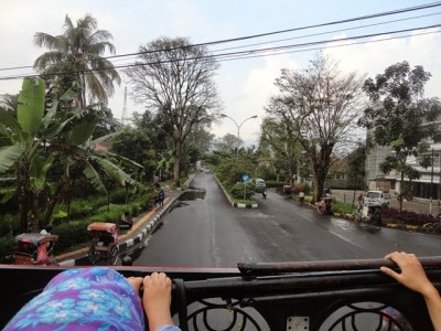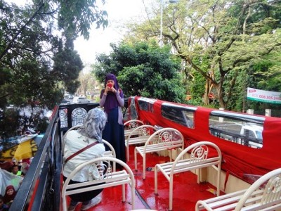 Rupanya kebiasaan naik Busway TransJakarta mengajarkan saya menjadi makhluk yang lihai dalam menyalip orang lain. Hehe. Bersama kawan Aleut lainnya, saya bisa duduk di lantai dua. Kami bersorak begitu bus ini jalan. Selain bisa melihat pemandangan, berada di lantai dua ini memiliki tantangan sendiri yaitu kami harus menghindari ranting pohon dan kabel listrik yang jaraknya begitu dekat dengan kepala. Tak jarang petugas Bandros mengingatkan kami untuk tidak berdiri.