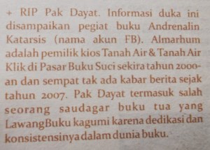 Adalah Pak Dayat orang yang banyak dikenang itu. Saya tidak pernah bertemu dengannya, apalagi mengenalnya secara pribadi. Tapi dari sejumlah obituari koleganya, saya membayangkan beliau adalah orang yang bersahaja-berkawan. Pada Pesta Buku Bandung yang berakhir tanggal 5 Februari kemarin, kabar duka tentang Pak Dayat pun saya temui di “koran” mini Lawang Buku. Di sana menyebutkan bahwa almarhum sempat berkiprah di Pasar Buku Suci.