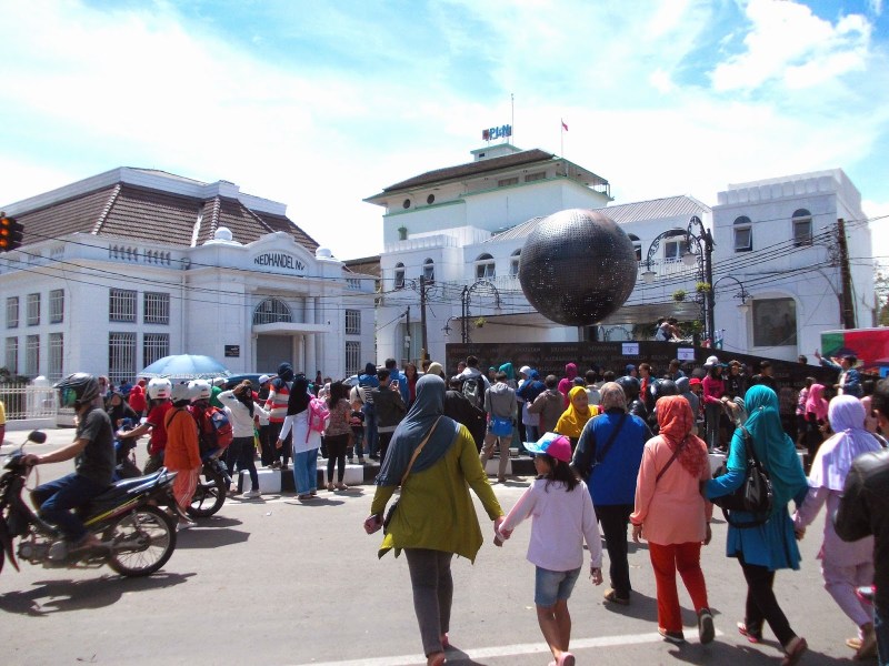 Di hareupeun gedung Nedhandel, nyaěta di bunderan deukeut jalan pameuntasan, dijieun monumen bola dunia nu sabudeureunna dipasang ngaran-ngaran nagara Asia Afrika. Bahanna tina alumunium, němpělna padu ngait wungkul dina paku nu narancěb dina těmbok. Tah ěta gě sarua loba nu ngararad. Sababaraha ngaran nagara deungeun caroplok jeung leungit, teuing dibarawa kamana.