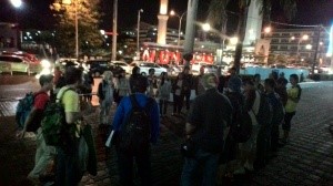 Titik pertama NgAleut malam itu adalah lokasi eks Bank Escompto yang sekarang jadi Bank Mandiri. Di titik itu, penggiat Aleut berjaket merah bernama Alex mulai bercerita adegan di “Rasia Bandoeng” yang mengambil latar di Bank Escompto.