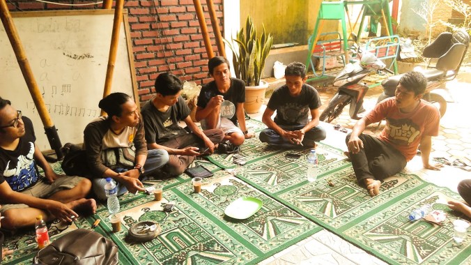 Akhirnya kami disambut oleh beberapa warga untuk berbincang santai di dalam Bale. Salah seorang yang dipanggil dengan nama Kang Iwan ditunjuk oleh kawannya yang lain untuk menjadi juru bicara. “Yah dulu bisa dibilang pemuda kampung sini tuh adalah sampah masyarakat, sering bentrok juga sama kampung sebelah, kalau udah lewat maghrib suasananya mencekam, anak gadis pasti dilarang keluar sama orang tuanya”, begitu cerita pembuka dari Kang Iwan mengenai masa lalu Blok Tempe.