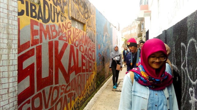 “Kang, upami bade ka Bale RT opat ka palih mana?”, tanya saya kepada seorang lelaki yang kaki kirinya dipenuhi tato. “Mangga, kantun lurus teras dugi mendak lapangan, engke mengkol ka katuhu”, begitu jawabnya sambil tersenyum ramah.