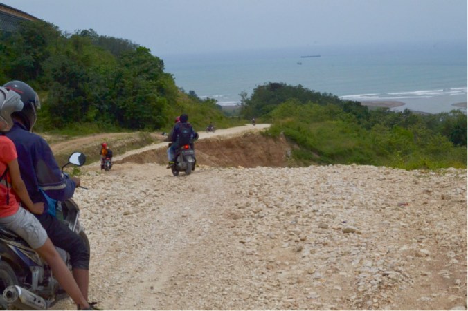Selesai menambal motor, kami melanjutkan perjalanan. Menujur jalur arah Pantai Sawarna. Tak mendatanginya, kami melewati Sawarna untuk langsung menuju Bayah. Jalur ini merupakan jalur favorit saya. Sampai pada akhirnya jalanan berubah perlahan menjadi kecoklatan, kami melewati pabrik semen dan menemui jalur yang seperti monorel. Setelah menghabiskan jalanan ini kami akhirnya sampai di Bayah.
