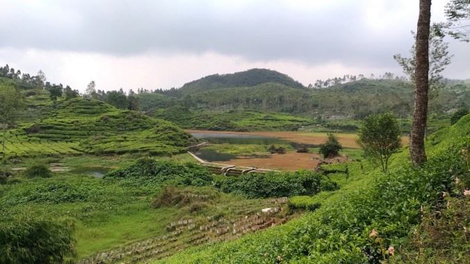 Di jalanan berbatu yang menurun ini, situasinya selalu sama, sisi sebelah kanan kebun teh dan sisi sebelah kiri hutan atau jurang. Kami sempat ragu karena ada beberapa cabang jalan di bagian dalam. Dalam keadaan begini, kami biasanya menugaskan beberapa orang sebagai advance ke masing-masing cabang jalan untuk memastikan jalur yang benar. Akhirnya kami tiba juga di jalur menanjak sebuah bukit dan di sisi kiri terhampar danau alam berukuran kecil yang indah. Beberapa kawan langsung menuruni jalan setapak di antara pohon-pohon teh untuk menuju danau. Di siang yang cerah ini, pemandangan danau terasa sangat indah dan membuat betah kami semua.