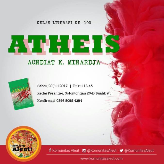 Kelas Literasi di hari Sabtu ini berjudul “Atheis”, yang merupakan sebuah roman fiksi karya Achdiat K. Mihardja pada tahun 1949. Buku ini sempat fenomenal di masanya dan mengambil setting di Kota Bandung.