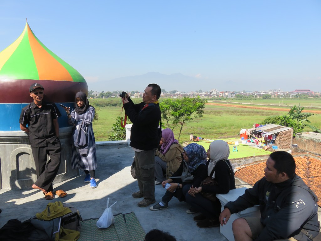 Dari atap masjidlah, kami bisa berada di ketinggian yang hampir setara dengan habitat para burung. Yang kami lihat di daun hijau bambu adalah burung-burung berwarna putih, yang kebanyakan adalah kuntul. Ada yang berdiam di sarang, ada juga yang berterbangan menjelajahi langit mendung. Dan dari ketinggian itulah, kami bisa melihat lahan-lahan bertanah coklat, truk-truk pengangkut tanah, traktor dan tanda-tanda mengganasnya pembangunan. Nyaris tidak ada pepohonan, sawah maupun semak-semak yang tersisa.