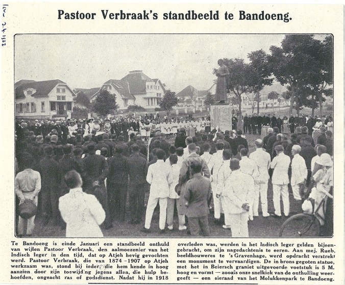 Patung Verbraak berdiri dengan gagah di sudut taman itu. Meski dibuat dengan ukuran yang tinggi, Rueb seperti tahu betul bahwa Verbraak adalah sosok yang rendah hati. Rueb pun menggambarkan gestur Verbraak dengan kepala yang sedikit tertunduk ke bawah, tidak tegak dengan angkuh. Kerut demi kerut di dahi sang pastor dibuat mengimbangi tatapannya yang teduh.