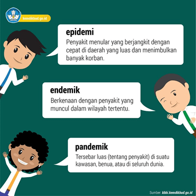 Pengertian wabah menurut Undang-undang nomor 4 tahun 1984 adalah kejadian berjangkitnya suatu penyakit menular dalam masyarakat yang jumlah penderitanya meningkat secara nyata melebihi keadaan yang lazim pada waktu dan daerah tertentu serta dapat menimbulkan bahaya atau bencana. Wabah dapat dibedakan menjadi epidemi, endemik, dan pandemik sesuai panduan dari kbbi sebagai berikut:
