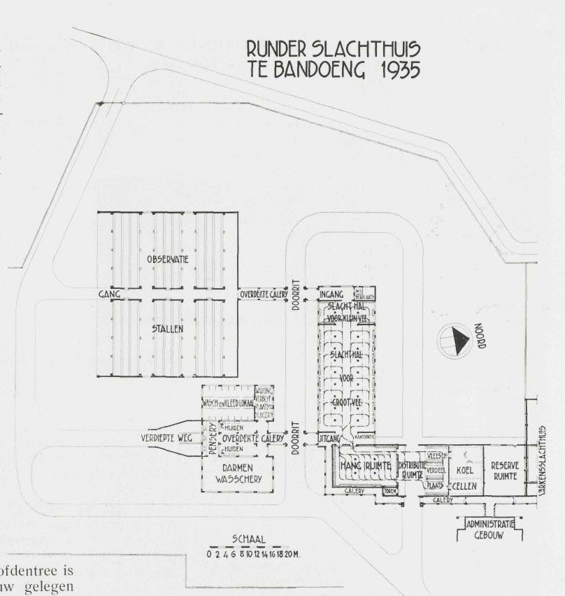 Romah pemotongan terseboet, terbagai dalam 3 bagean, jang kesatoe bagean oentoek administratie dengan romah-romah boeat personeel, kedoeanja oentoek pemotongan babi dan bagean kandang, ketiganja bagean jang digoenakan motong lemboe. Dalam gambar-gambar jang terlampir dalam karangan bahasa Belanda dari ini hal, dapat diperiksa bagimana roepa dan atoeranja bagean-bagean romah pemotongan itoe. Dalam rentjana, jang dipentingkan jalah oentoek memisah bagean pemotongan lemboe dari pemotongan babi. Lagi poela didjoeroesan satoe sahadja, sedang daging lemboe bisa terangkat dengan djalan rail diatas, dengan tjabang-tjabang ka masing-masing bagean romah pemotongan. Daging kotor seperti peroet, dlsb. diangkat dengan kereta ketjil dan di simpan dibagean sendiri, kerena itoepoen soeatoe kepentingan jang bersamboetan dengan atoeran hygiëne. Disediakan poela tempat oentoek keperloean personeel, seperti boeat tjoetji, dlsb.
