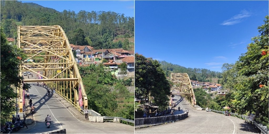 Perjalan kami mulai pagi hari, langsug menuju Jembatan Kamojang, di Kecamatan Ibun, Kabupaten Bandung. Membaca di wikipedia, jembatan kuning ini dibangun tahun 2016 dengan panjang 138 meter dan ketinggian 1180 mdpl. Di bawah, mengalir Sungai Ibun. Sejak dibangun sempat berulangkali menjadi viral, baik karena keindahan pemandangannya, maupun karena banyaknya peristiwa kecelakaan yang terjadi di sekitar jembatan ini. Dari arah kami datang, Majalaya, tanjakan di bagian akhirnya luar biasa curam dan panjang pula, motor kawan kami sempat kepayahan untuk naik. Dari arah sebaliknya, berupa turunan panjang yang konon saat hujan sering licin, dan katanya faktor ini yang menjadi sebab terjadinya sejumlah kecelakaan.
