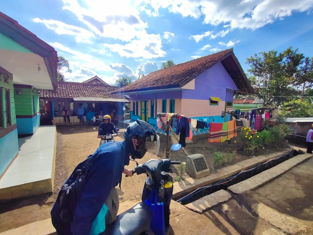 Singkat cerita kami tiba di Kampung Waspada yang ternyata cukup padat. Rumah-rumahnya kebanyakan berbahan kayu. Jalur jalanan di antara rumah-rumah cukup sempit dan kontur tanah naik turun cukup curam. Di sebuah rumah yang ada warung dan halaman cukup luas untuk memarkikan motor, kami berhenti. Ada beberapa ibu-ibu sedang ngobrol dan tampaknya mereka cukup amazed oleh kedatangan kami, mungkin terlihat seperti mahluk-mahluk planet yang muncul tiba-tiba dari balik pepohonan.