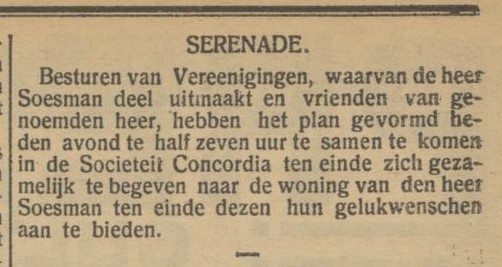 Para pengurus perkumpulan di mana Tuan Soesman menjadi anggotanya dan para sahabat dari pria tersebut telah membuat rencana untuk bertemu malam ini pada pukul setengah tujuh di Concordia Society untuk bersama-sama pergi ke rumah Tuan Soesman guna menyampaikan ucapan selamat.