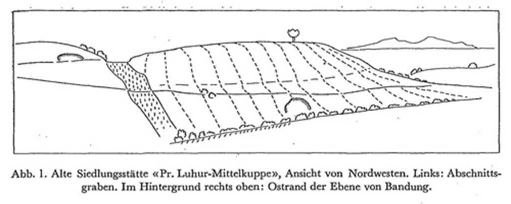 Von Koenigswald sebelumnya sudah menyatakan bahwa beberapa tempat permukiman tua di perbukitan utara itu, seperti kawasan KQ-380 dan Ciharalang, permukaannya diratakan oleh manusia (bukan alami). Rothpletz menambahkan bahwa selain itu juga di banyak tempat terdapat parit pemisan dan tebing buatan, serta beberapa tempat permukiman diperkuat dengan tanggul tanah. Paling sedikit ada 15 lokasi permukiman tua yang terletak di punggungan bukit dan dipisahkan dari sekitarnya oleh parit-parit melintang selebar kira-kira 10 meter atau hanya oleh tebing curam. Ada beberapa lokasi permukiman yang dilindungi dari satu sisi oleh dua parit berurutan, jaraknya sekitar 100-150 meter, yang mungkin setara dengan jarak tembak panah. Selain itu, di kedua sisi punggungan, kemiringan alai lereng sering dibuat lebih curam yang biasanya disambung dengan suatu teras.